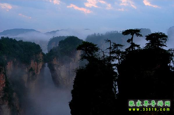 在“后花園”的對(duì)面,是一座巍峨的山巒,山上古木參天,遮天蔽日。森林中常有野山羊出沒,夜深人靜之際,常能聽到野羊羔“咩洋”地叫聲,因此被稱作“羊寨”。民國(guó)時(shí)期,此地曾為土匪占領(lǐng),直到現(xiàn)地,山上還殘留有卡門、暗堡、斷壕、屋場(chǎng)、水井、碓臼、磨坊等殘跡。粗大的松樹上還留有土匪當(dāng)年留下的“V”字型標(biāo)志。站在“山寨”上,舉目眺望,可看見金鞭溪全景,只見一條美麗的溪水從數(shù)百座石林中緩緩穿過,顯得是那樣的幽靜、和諧。從“后花園”向前步行約100米,便是袁家界又一處絕世奇觀——迷魂臺(tái),走上迷魂臺(tái),只見上百座山巒拔地而起,峰涌而至,它們姿態(tài)萬千、氣勢(shì)非凡;有的似“天狗望月”,有的像“海螺出水”;有的像“將軍列隊(duì)”,有的如“一柱擎天”。幾道山坳和屏障將這些山巒有序的分開,使這些石峰更顯得層次分明,井然有序,在萬道霞光的點(diǎn)綴下,顯得蔚為壯觀,不同凡響。這更像是一幅畫家筆下的水墨丹青,“迷魂臺(tái)”攬勝,真宛如仙境神游啊。