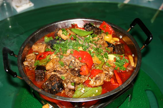 【 酸辣子炒沙蘿菇 】 當(dāng)?shù)卮合募居旰?,山頭巖石壁上生長的墨綠色地菇——地衣(本地名為沙蘿菇),采集后用清水反復(fù)多沖洗幾次。再用壇子腌的酸辣椒和大蒜一起炒熟,出鍋后灑些許香蔥即成一道色、香、味俱全的地方特色小吃。