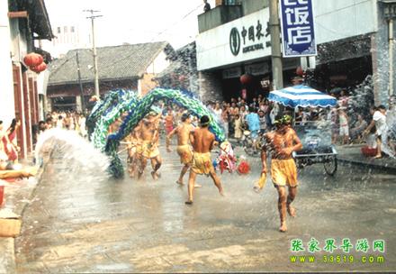 張家界潑水龍又叫“澆水龍”,于唐朝時期由移居本地的白族興起演變而成,在永定區(qū)的尹家溪鎮(zhèn)西尹村、莫家崗村十分盛行,是當?shù)?a class="insidelink" href="http://www.cqyrj.com/fengqing/1130174734.html" target="_blank" title="土家族">土家族,白族、苗族在天熱干旱時節(jié)求雨祈福的一種形式。一旦出現(xiàn)旱災,當?shù)仡^面人物就會出來組織潑水龍,演出極其隆重。