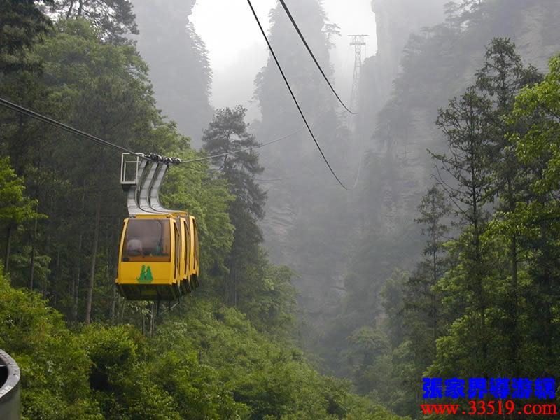 (索道站)現(xiàn)在,我們就要乘索道下山了。黃石寨(黃獅寨)索道是1995年5月至1997年9月臺(tái)灣證吉興業(yè)有限公司與張家界公園管理處合資興建的我市第一條觀光索道。索道線路水平距863,高差431米,運(yùn)行速度每秒8米,單向小時(shí)運(yùn)量948人,設(shè)備全部從法國波馬公司引進(jìn),總投資4000多萬人民幣。黃石寨(黃獅寨)索道的建成,為公園開辟了一條空中游覽線,填補(bǔ)了張家界無觀光索道的空白。古詩說:會(huì)當(dāng)凌絕頂,一覽眾山小。乘索道觀張家界公園,別是一番感受。