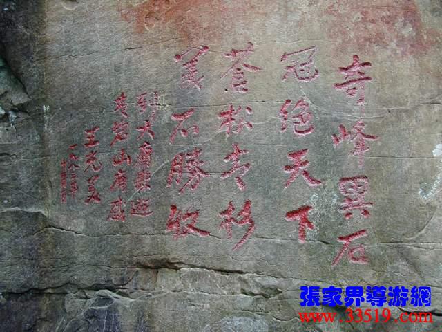 (王光美詩刻)1983年11月30日,前國家主席劉少奇夫人王光美在省人大副主任羅秋月等人陪同下,登上了張家界,她是最早訪問張家界的上層名流。想當(dāng)年,這里還是一條人工剛剛挖出來的小毛路,王光美被一路風(fēng)光所震撼,也不免勾起了許多關(guān)于劉少奇的往事。這四句詩并不是一氣呵成的,前后到了四處景點(diǎn),才吟出這四句詩來:奇峰異石,冠絕天下,蒼松青杉,美不勝收。