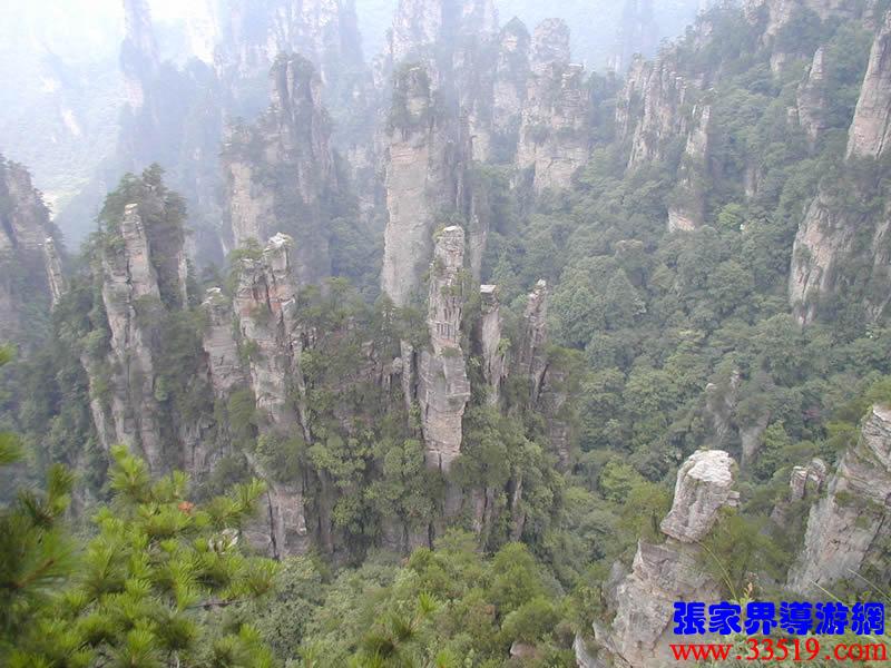 (大觀臺(tái))這就是大觀臺(tái)。極目遠(yuǎn)眺,千百座奇峰盡收眼底。一位詩人說,武陵源的砂巖峰林是一步一觀景,千步千造型,一山有四季,十步不同天。專家測(cè)算出武陵源石峰有3103座。一如一位高超的雕塑大師,模擬宇宙萬物,無不形狀逼真,維妙維肖,栩栩如生,呼之欲動(dòng)。有的如海螺出水,有的如金龜銜日,有的如蓮花盛開,有的如天橋橫空,有的如長(zhǎng)槍刺天,有的如寶塔聳立,有的如老人采藥,有的如玉女梳妝,有的如將軍出征,有的如戰(zhàn)馬長(zhǎng)嘯,有的如情人幽會(huì),有的如夫妻相擁,有的如仙女散花,有的如村姑守望.....有的孤峰獨(dú)秀,有的直插云霄,有的婷婷玉立,有的威武勇猛,有的小巧玲瓏,有的大氣磅礴。進(jìn)入武陵源,但見一片峰的森林,峰的世界,峰的海洋。挺拔、奇秀、集中、原始、粗獷、古野。這就是武陵源。一位藝術(shù)大師說:武陵源的山峰,改寫了山的概念。大攝影家陳勃說:“三山五岳堪比美,華夏風(fēng)光每一流。”王繼杰先生說:“武陵源上三日游,勝讀千篇李杜詩。”許世杰先生說:“秀幽險(xiǎn)峻稱奇絕,五岳黃山拜下風(fēng)。”李成瑞先生為此大抱不平:“神州勝景誰為最?須請(qǐng)霞公重評(píng)勘。”可惜徐霞客無緣到大觀臺(tái)來,也不可能為武陵源作甚評(píng)價(jià)了。