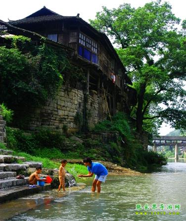 民宅多為吊腳木樓,依山傍水而建,臨河者倒影澄潭如水中街市,依山者雄峙高崖似空中樓閣。兩條河潔凈透亮,其中小河尤為美麗,青山夾岸,綠水長流,河畔蓼紅芷白,桂馥蘭芳,素有“香溪”之稱。其水盡來自溶洞,距街三里之內(nèi),就有魷魚洞、犀牛洞、王家洞、向家洞幾股洞泉和一個叫“雞屎潭”的溫泉。 “雞屎潭”來有濃重的硫磺味,水溫如沸,除污力極強,根本不需肥皂便能將汗?jié)n洗得干干凈凈,并能醫(yī)治瘡疥,維護皮膚健康。河中多魷魚,肉嫩且肥,立冬前盡逆水潛入溶洞起冬,立夏前兩三天則成群結隊隨夏汛而出,鄉(xiāng)人在洞口安上網(wǎng)壕,只需“守株待兔”,便能得到豐盛的收獲。在20世紀70年代以前,有時每天可得幾百斤。 小河灘多流急,是漂流的極佳去處。