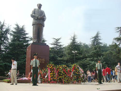 毛澤東銅像位于韶山沖的中心,紀念館、毛氏宗祠與韶山賓館之間。銅像區(qū)占地5200平方米,是經中共中央批準興建紀念毛澤東同志誕辰100周年的重點獻禮工程。這里原是一片沃野,地勢平坦開闊,周圍群山拱護。韶蜂在遠處,高峻挺拔,云富坨大山巍峨雄壯,十八羅漢山逶迤綿長,黑石寨鐵骨錚錚。在山的襯托下,銅像更顯得氣勢磅礴。