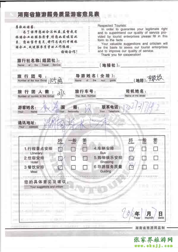 2010年11月7日長沙袁先生一行27位旅游質(zhì)量反饋
