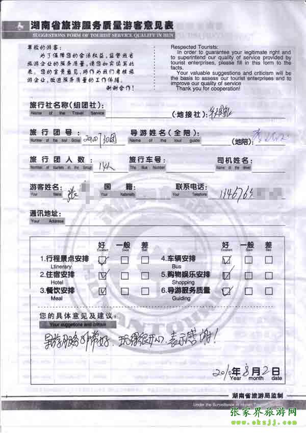 2010年8月2日張先生一行14位旅游質(zhì)量反饋