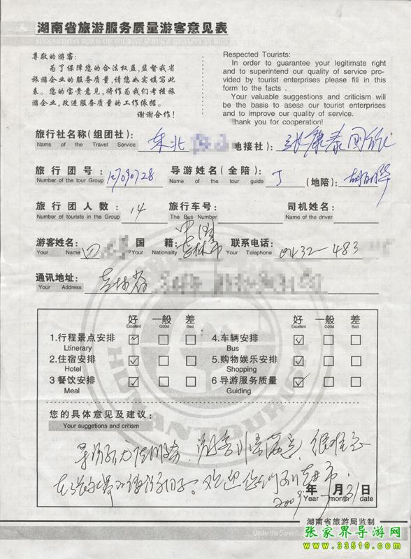 2009年7月28日吉林田先生一行14人接待質量反饋單:
