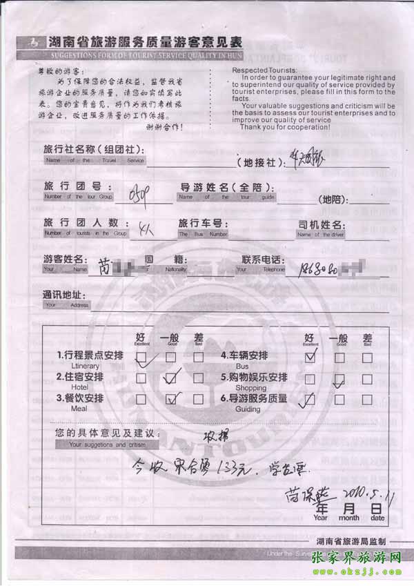 2010年5月11日苗小姐一行4位旅游質量反饋
