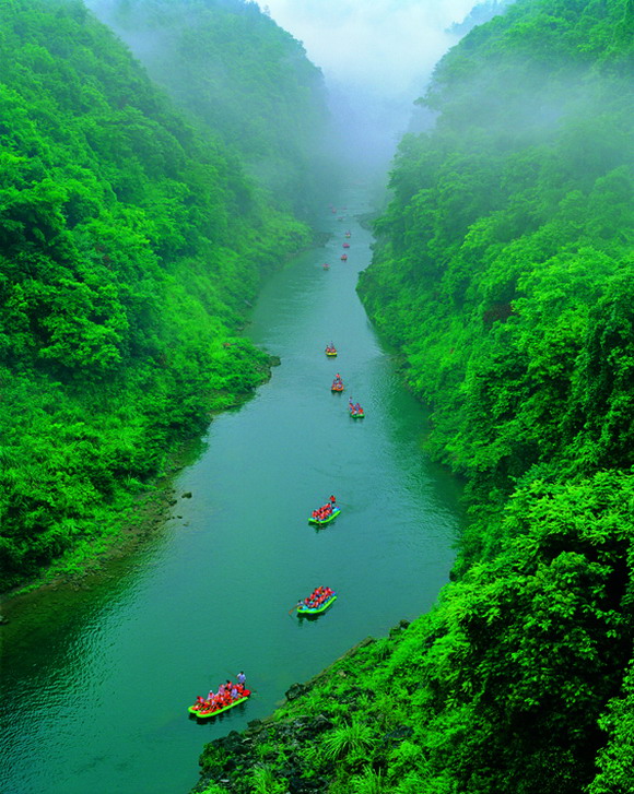 7點準時等在萊頓大酒店門口,猛洞河漂流180元/人,漂流的車一般會來接參加漂流的客人的,上了車已經(jīng)有好幾位游客,然后車子又去接了幾位,7:30人接齊,離開張家界去猛洞河,車程約1個半個小時,漂流約2個半小時。在萊頓大酒店的那個晚上張家界半夜打雷下雨,我們想今天水很大,漂流會很刺激。到了那邊才知道上游建了水壩調(diào)節(jié)水量搞平均主義,所以漂流的驚險度一般般了,后來去鳳凰公路上比較顛簸,我戲稱可以將車當船補足漂流的感覺,呵呵。不過瀑布因此壯觀不少,漂流沿途至少見到有七八條瀑布,非常漂亮。